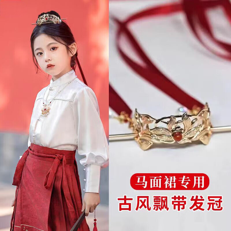 XPEL儿童高马尾古风束发冠服饰品汉服头饰莲花冠合金头冠马面裙配饰 发冠【红色飘带款】
