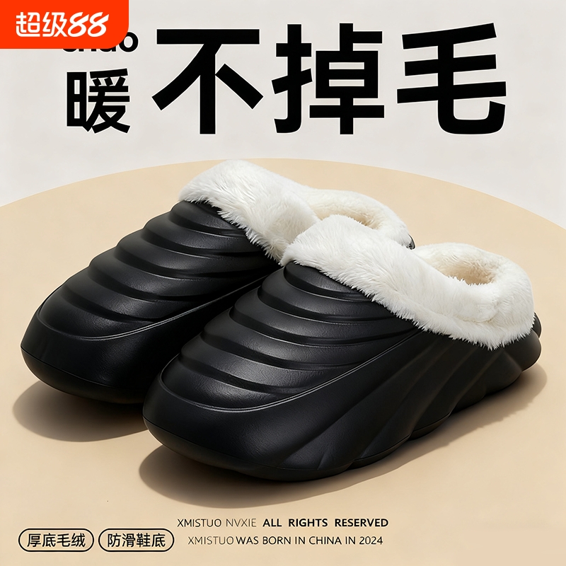 朴西星月棉拖鞋女冬季外穿加绒加厚包头毛绒拖鞋室内保暖厚底棉拖