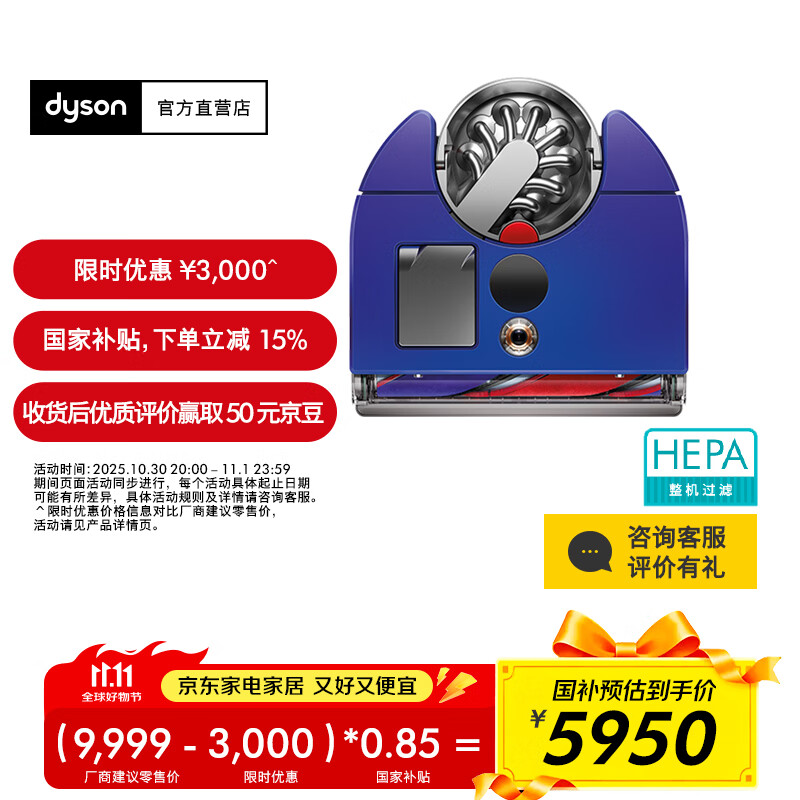 戴森(DYSON)【双十一抢购】360 Vis Nav智能吸尘机器人 全自动智能吸尘 强劲吸力 智能app/语音控制 家用礼物 蓝色