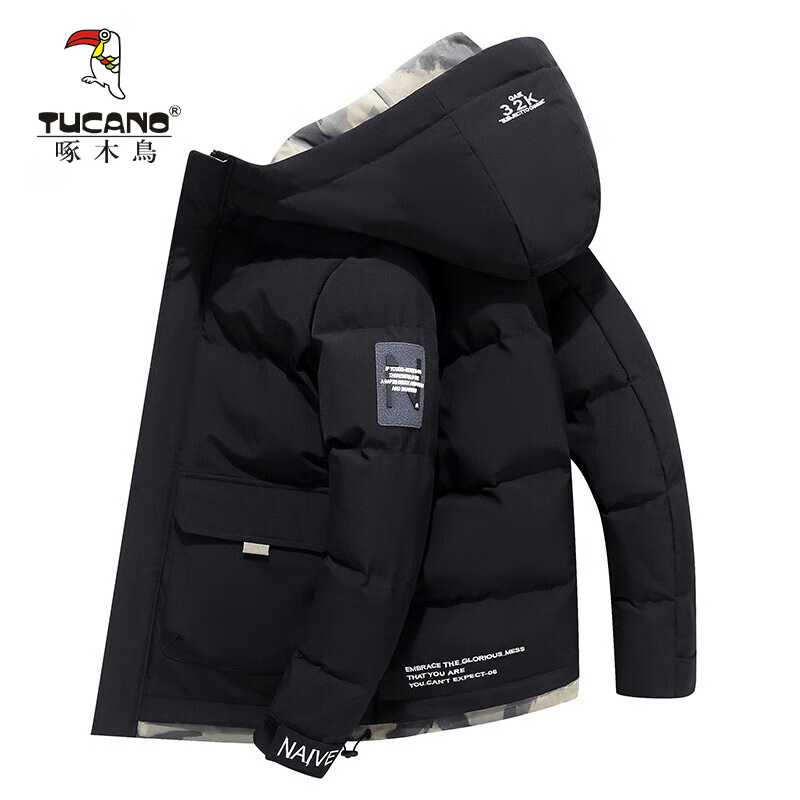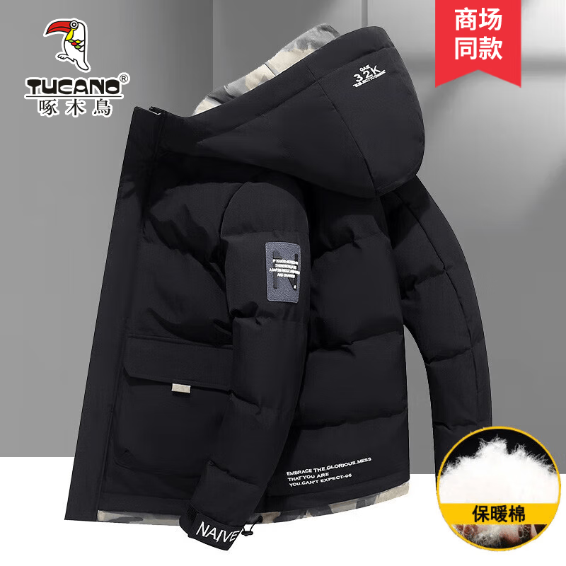 啄木鸟户外运动棉服男冬季新款加棉保暖外套男防风连帽羽面包绒上衣服男 黑色 2XL (建议135-160斤)