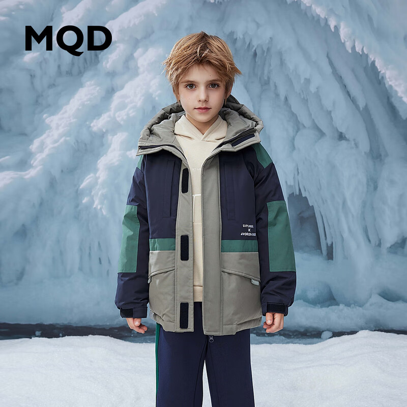 MQD童装男大童2023年冬季户外风撞色拼接羽绒服 藏青 140
