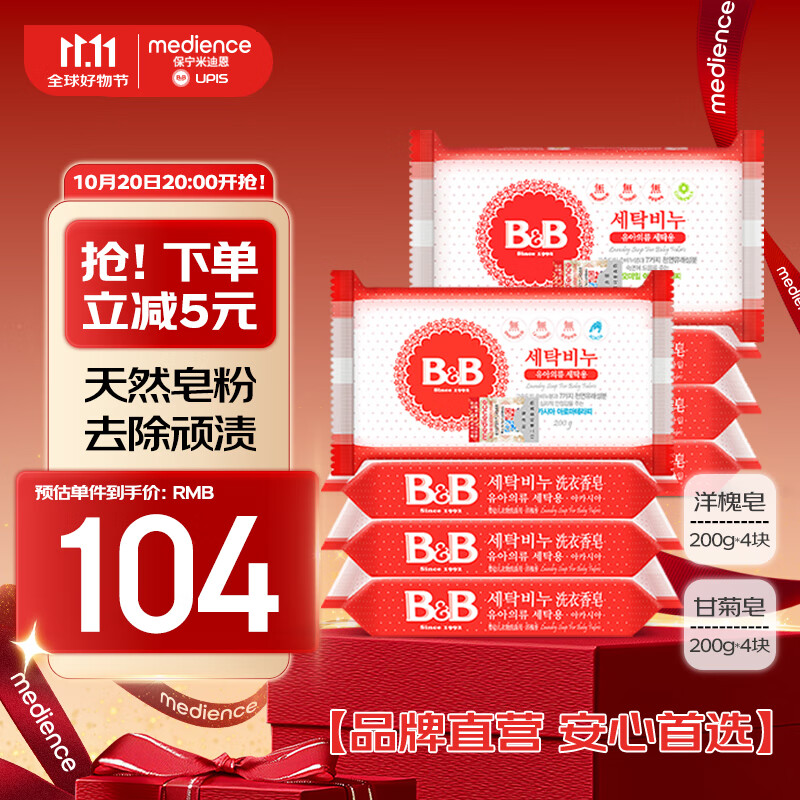 保宁(B&B)婴幼儿洗衣皂儿童肥皂尿布皂专用内衣裤肥皂200g*8【到手共8块】