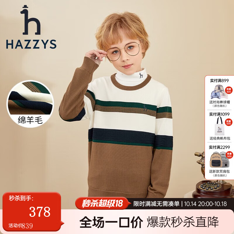 哈吉斯(HAZZYS)童装男童儿童毛衣秋新品中大童经典圆领撞色套头线衣 棕驼色 110