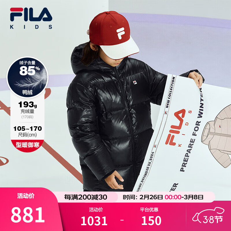 FILA斐乐童装儿童羽绒服中长款冬新款棉羽大小童加厚保暖外套 炭黑-BK 130