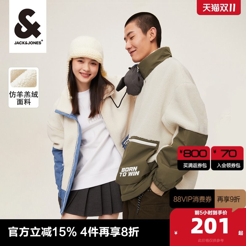 杰克琼斯外套夹克棉服男春季衣服撞色仿羊羔毛口袋立领夹克男装