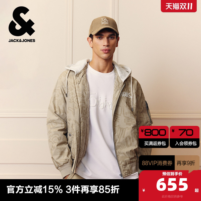 E11卡其色 165/88A/XS 杰克琼斯奥特莱斯男装棉服冬季新款时尚刺绣logo宽松连帽保暖外套