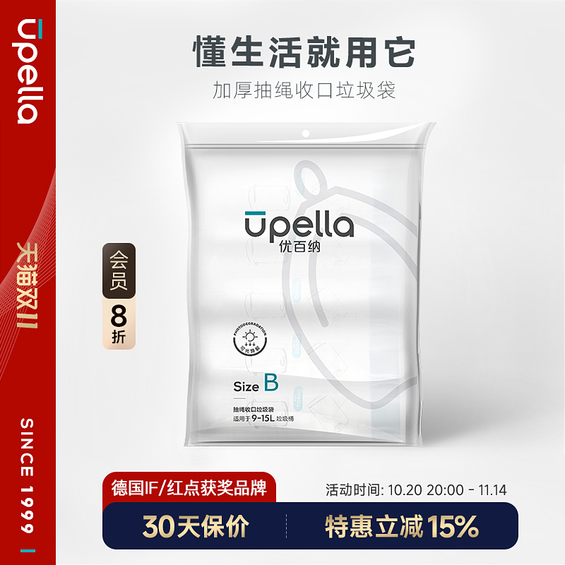 优百纳加厚抽绳收口手提垃圾袋可光降解塑料袋大号中号5卷免撕
