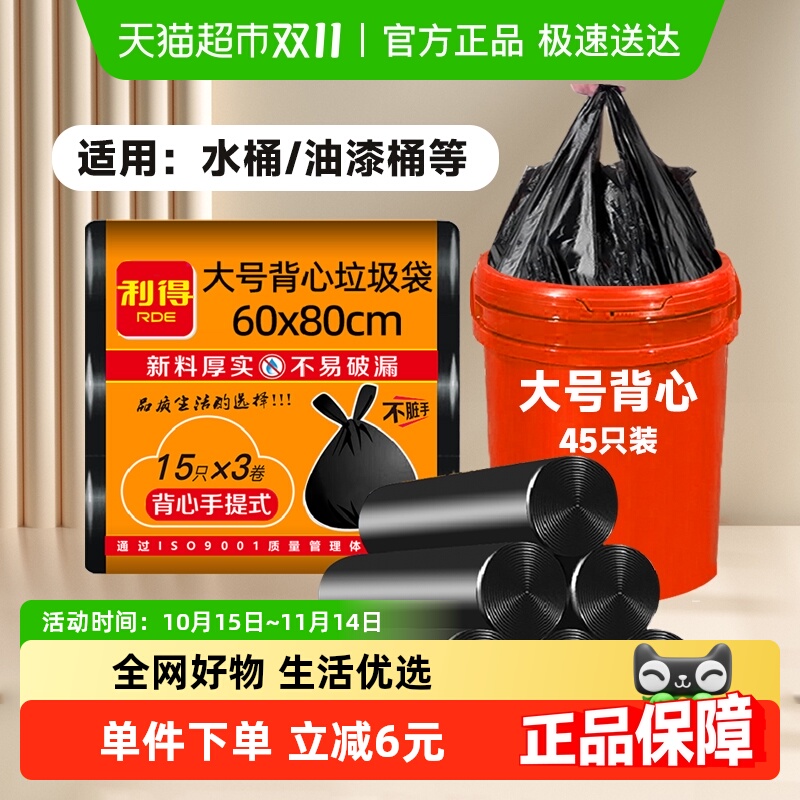 利得背心黑色加厚大号手提塑料垃圾袋家用厨房60*80*45只*1包