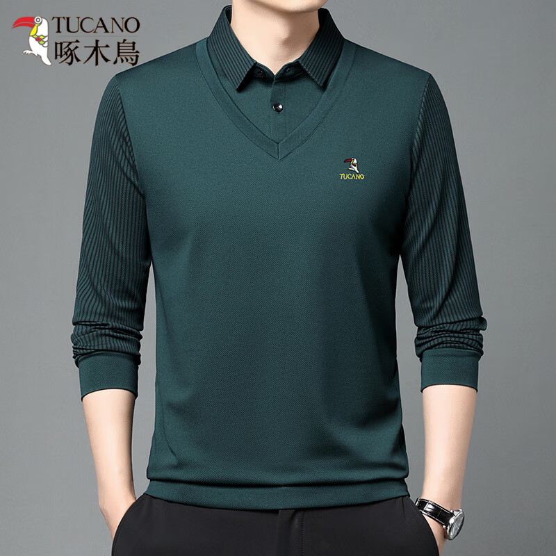 百亿补贴:啄木鸟长袖t恤男士秋季假两件衬衫领纯棉POLO衫时尚条纹休闲抗皱外套 809条纹领【墨绿】 M 165/ 建议90-110斤