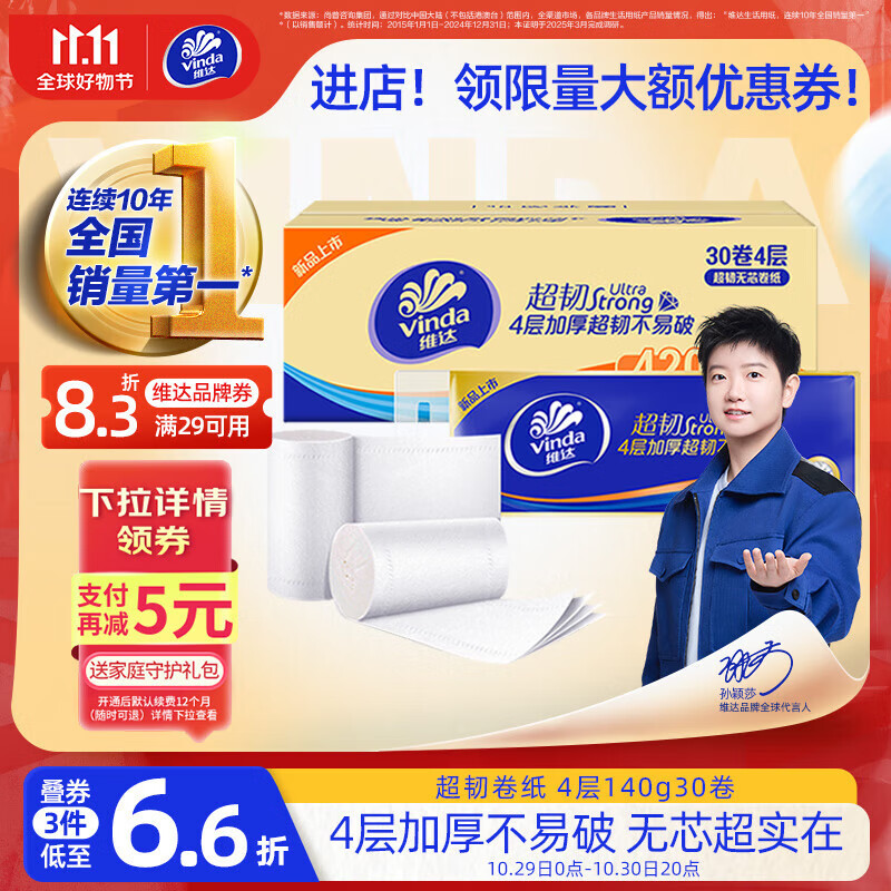 维达(Vinda)无芯卷纸 超韧4层140克*30卷 加厚升级 卫生纸厕纸 卷筒纸 整箱