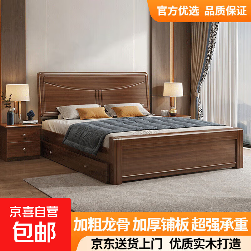 12床实木床新中式床1.8米双人床主卧单人床家用1.5米加厚储物床 1.5米胡桃色单床+10cm床垫