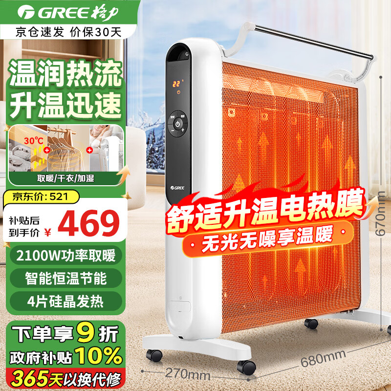 格力(GREE)取暖器家用智能恒温硅晶电热膜式电暖机 节能省电暖气无光防烫大功率速热加湿干衣遥控定时电暖器 NDYM-S6021B