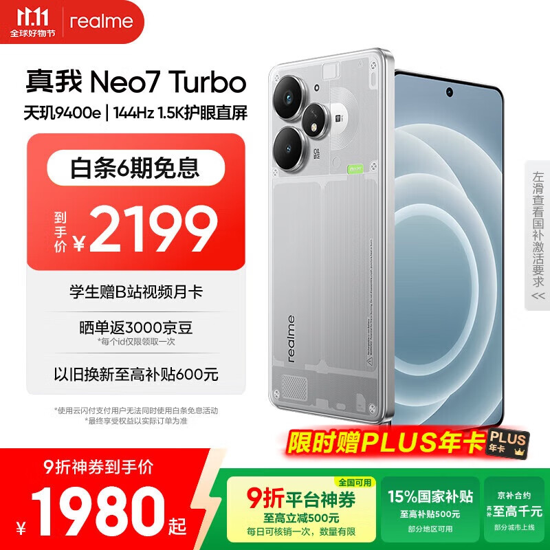 realme 真我Neo7 Turbo 新品5G拍照游戏电竞手机 天玑9400e 7200mAh电池长续航+100W快充 极窄边框直屏 透明灰 12GB+256GB 12期免息