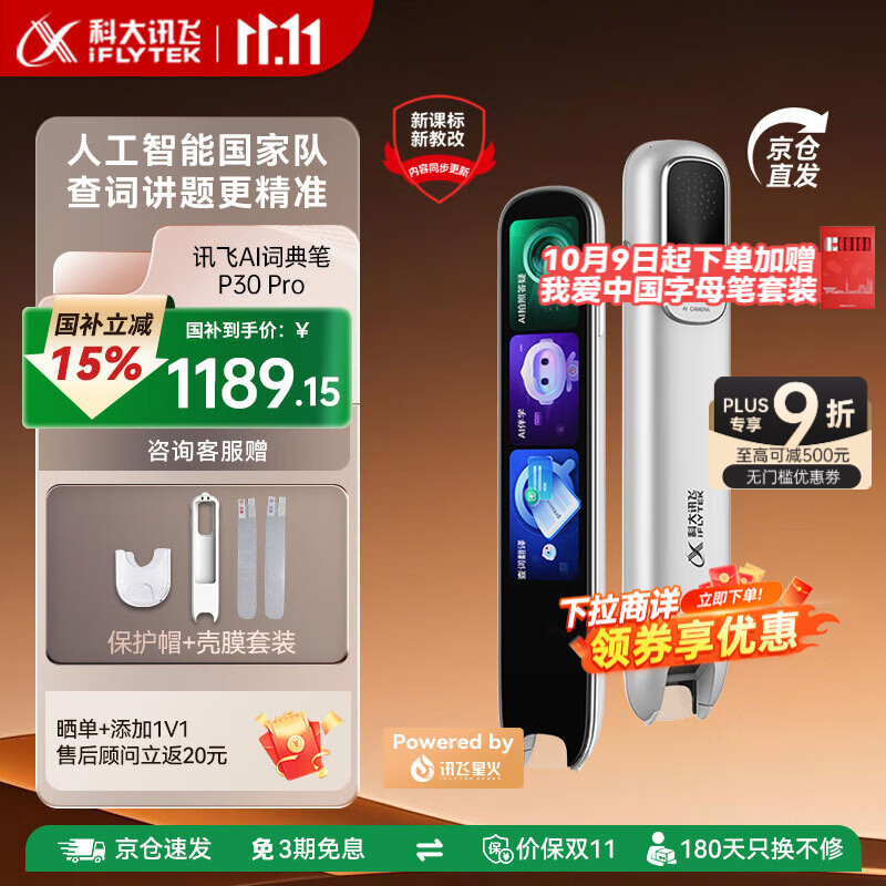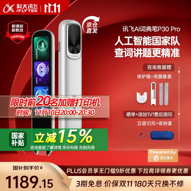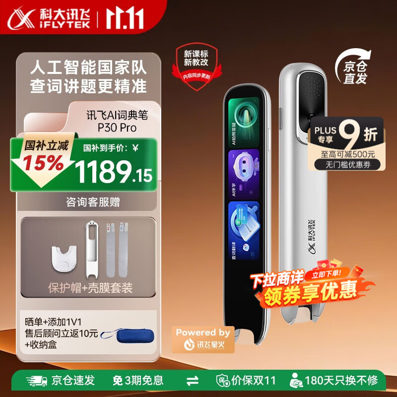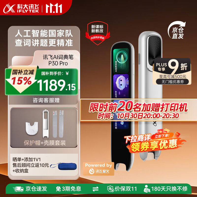 【支持9折消费券+15%国补】科大讯飞AI词典笔P30Pro长续航 点读笔 翻译笔通用英语单词 电子词典笔学习 词典笔P30 Pro 官方标配