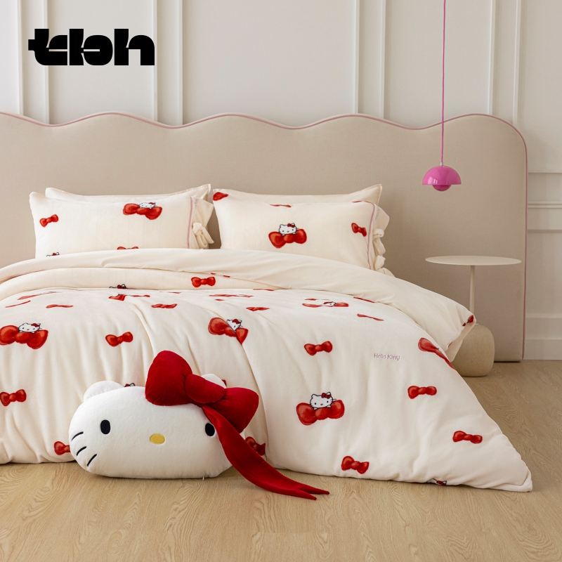 床笠款四件套-适用1.5米床,建议搭200*230cm被芯 Hello Kitty双感暖绒床品 粉红条纹 tbh野兽派家居HelloKitty暖绒三/四件套