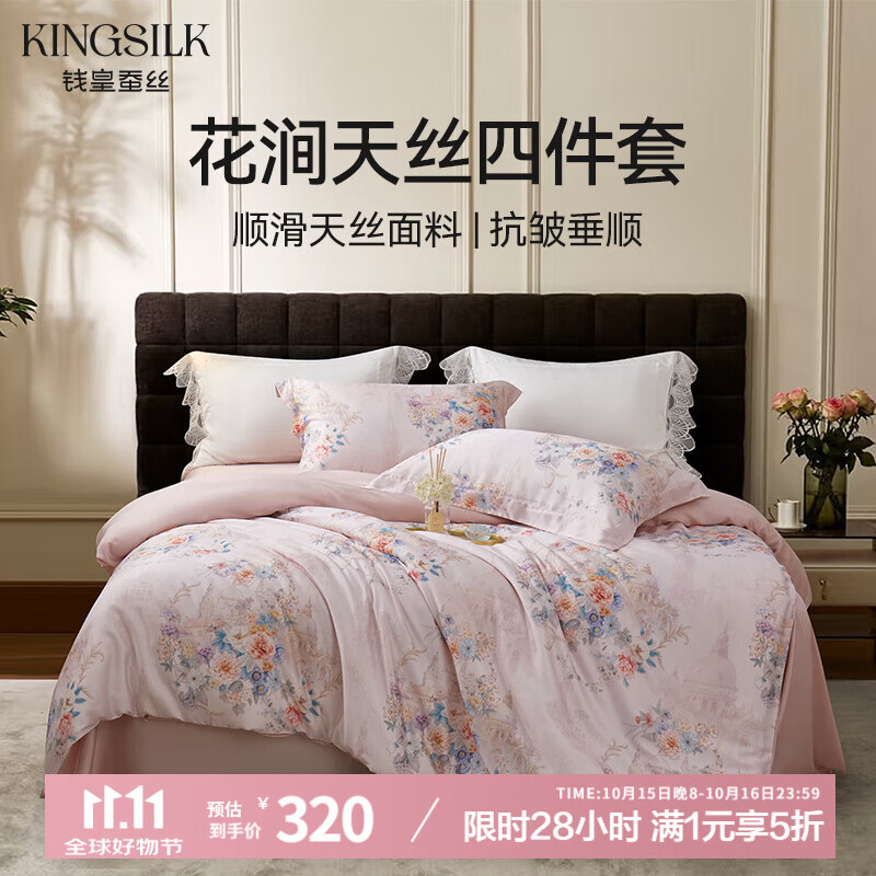 钱皇花涧天丝套件床上四件套床单被套亲肤舒适透气兰精天丝面料粉色 粉色 床单款 (被套220*240cm)