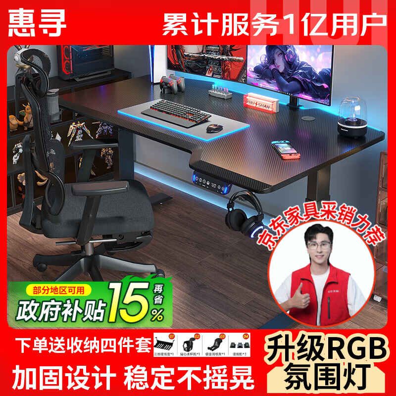 惠寻京东自有品牌电动升降电脑桌台式可升降工作台RGB灯游戏电竞桌子 M3单电机碳纤维Pro 120*78【高配RGB灯】