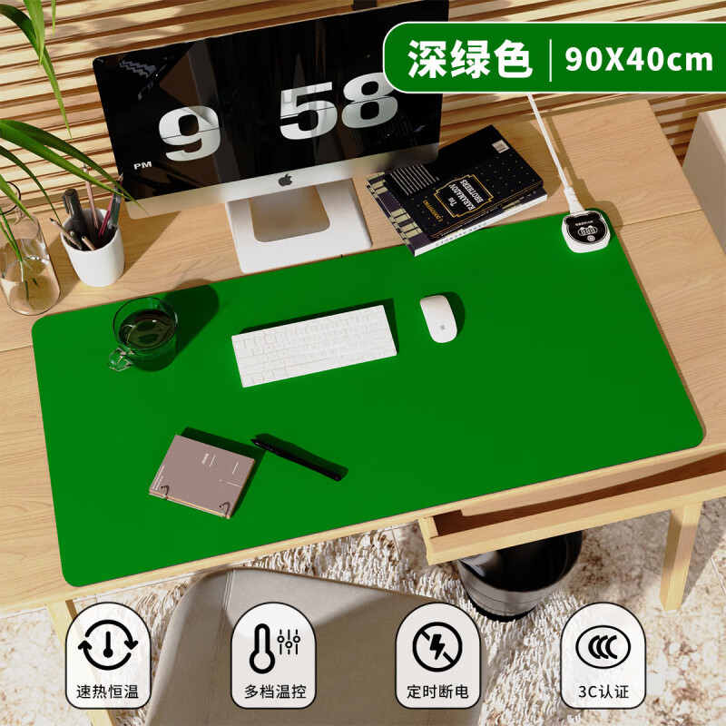 艾风格加热鼠标垫办公室超大电脑桌面防水桌垫宿舍学生写作业纯色暖桌垫 深绿 90*40-6档数显定时款