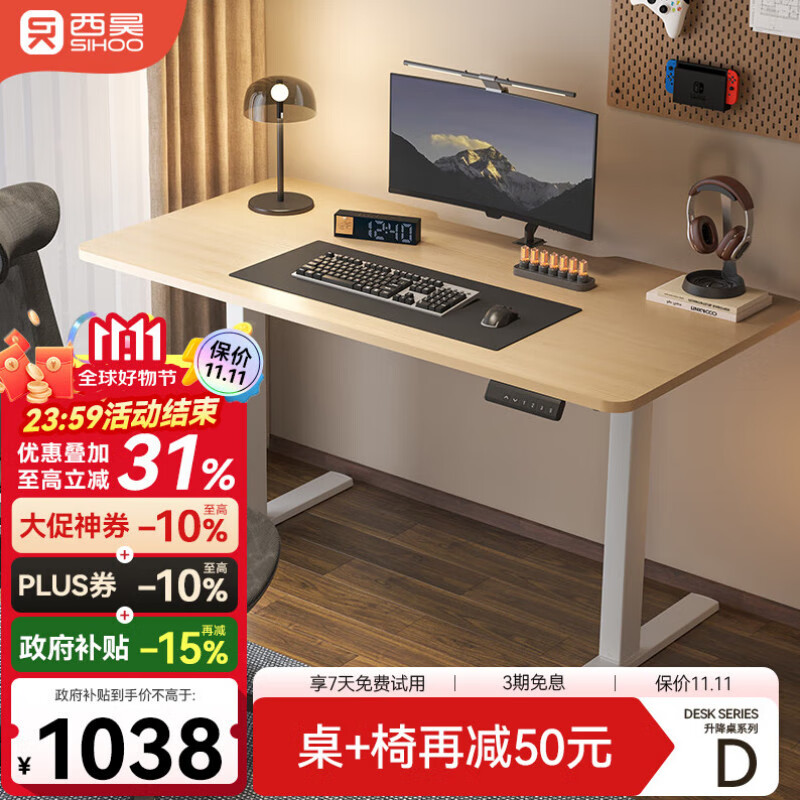 西昊D03S电动升降桌电脑桌电竞桌书桌办公学习桌子实木板1.4m浅枫木色