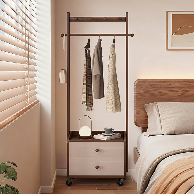 【实木中号】胡桃色+洛克灰两抽落地款 实木床头柜衣帽架一体可移动卧室床边收纳挂衣架落地多功能置物架