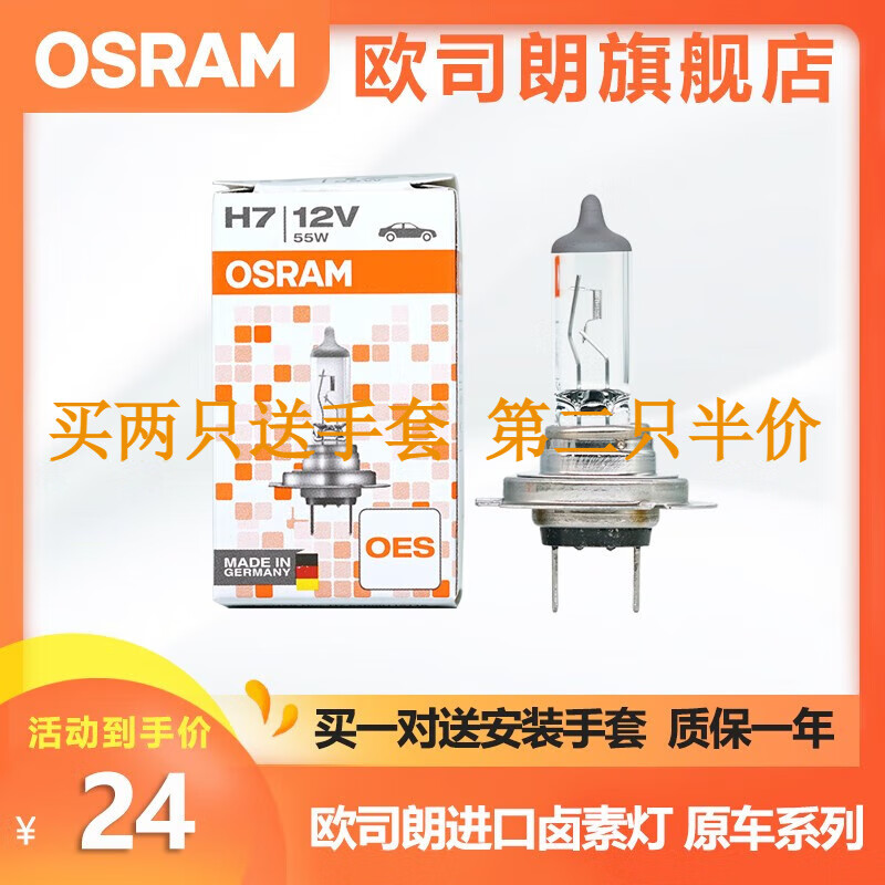 欧司朗卤素汽车灯泡12V前大灯远光灯近光灯车灯泡长寿型(单只装) 【H7】12V 55W 进口单个