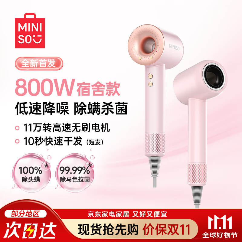名创优品(MINISO)高速吹风机入门款高速电吹风机快速干发顺发不伤发大功率家用礼物大风力宿舍吹风筒 宿舍款【樱花粉】800W功率+快速干发