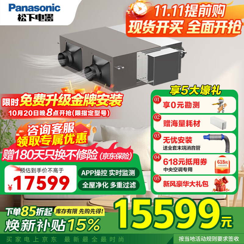 松下(Panasonic) 新风系统 消毒杀菌一体卫健委认证家用中央吊顶式管道新风机全热交换器内外双循环去PM2.5过敏原 FY-35ZJD2C(建议120-160平米)
