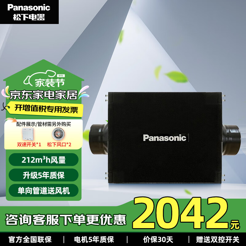 松下(Panasonic)新风机 单向管道式PM2.5净化新风机 吊顶家用卧室空气净化清风换气机 【套装含配件】FV-MDN012