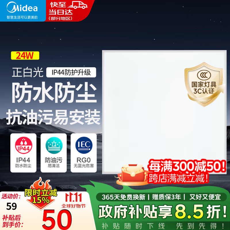 美的(Midea)厨房灯led扣板灯300x300集成吊顶平板灯厨房吸顶灯卫生间浴室灯 24W|防水防尘|易清洁