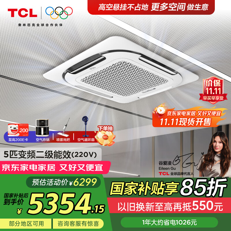 TCL中央空调5匹天花机变频一级能效3匹嵌入式吸顶空调 一拖一天井机商铺饭店办公室厂房吊顶商用空调 5匹 一级能效 【真省电-冷暖220V】