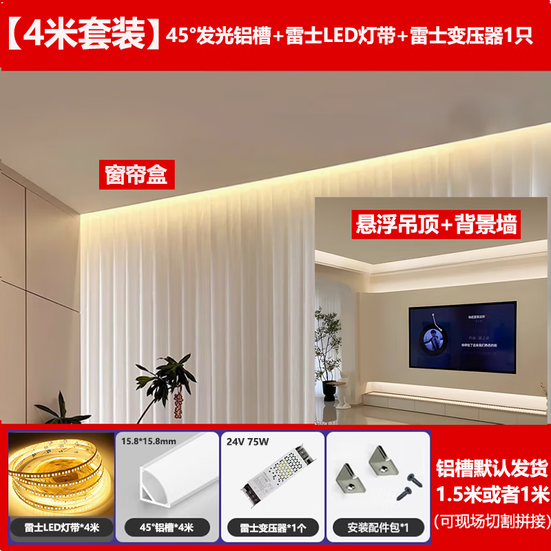 雷士照明45度窗帘盒灯带洗帘灯阴角线条灯槽悬浮吊顶明装三角线形灯全套 雷士45度灯带(4米)+变压器 低压24V暖黄光3000K
