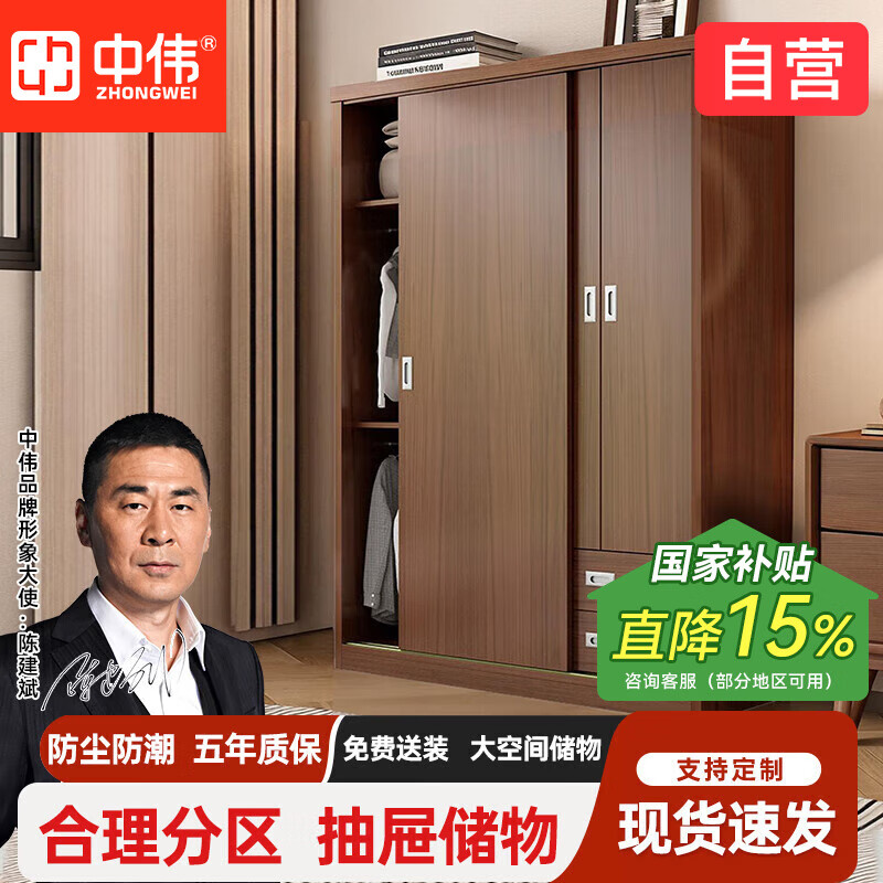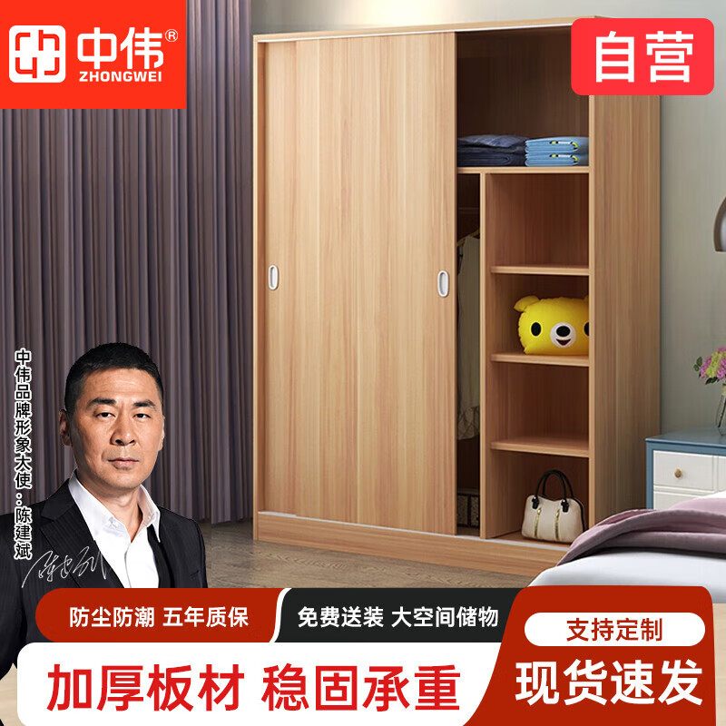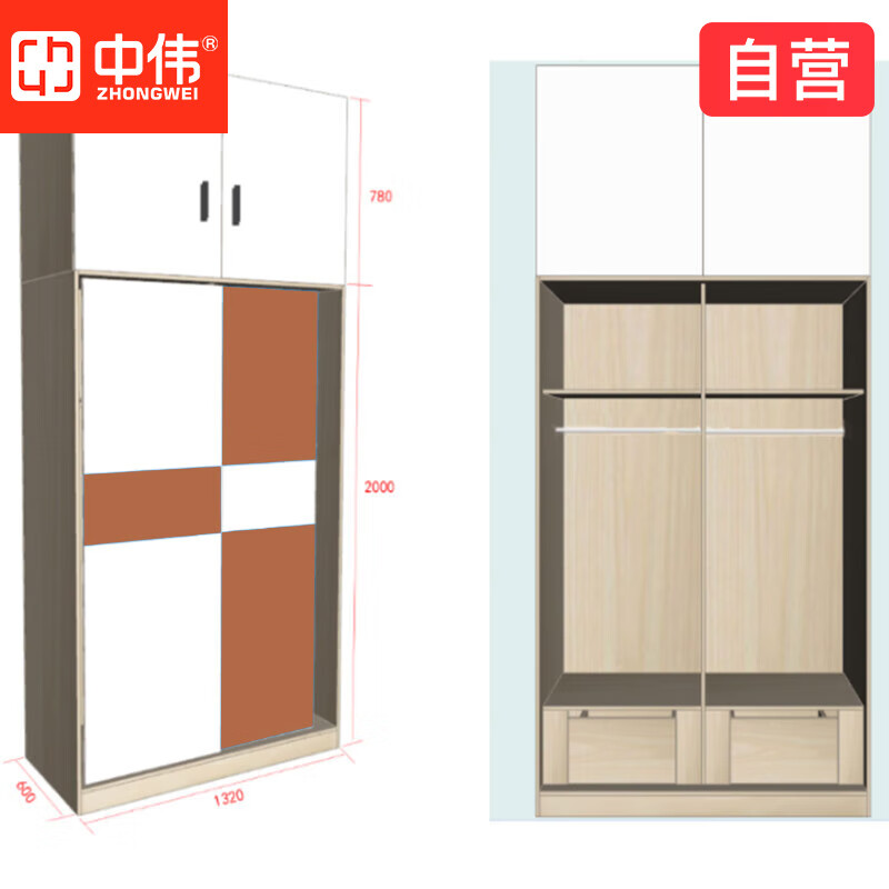 中伟移门更衣柜简易推拉门家用出租房卧室收纳木质简约二门衣柜含顶柜