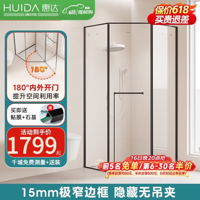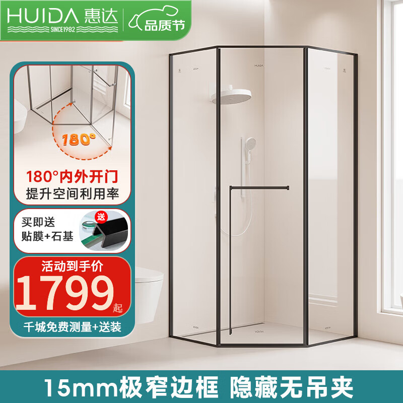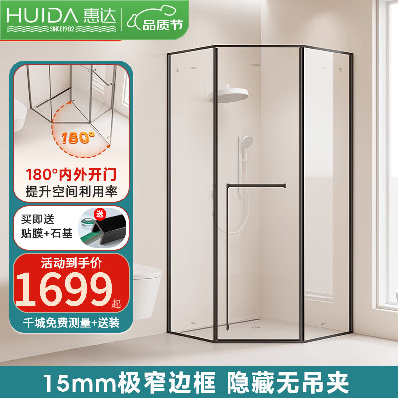 惠达(HUIDA)钻石型淋浴房玻璃隔断钻石型移门干湿分离极窄卫生间浴室浴屏浴房 雅黑【180°内外开门 极简设计】 900*900**2000mm