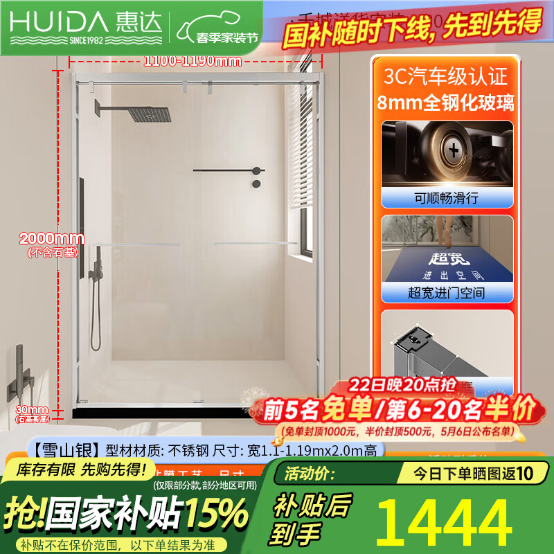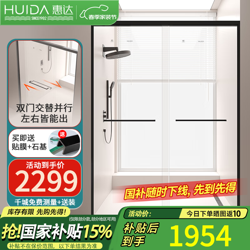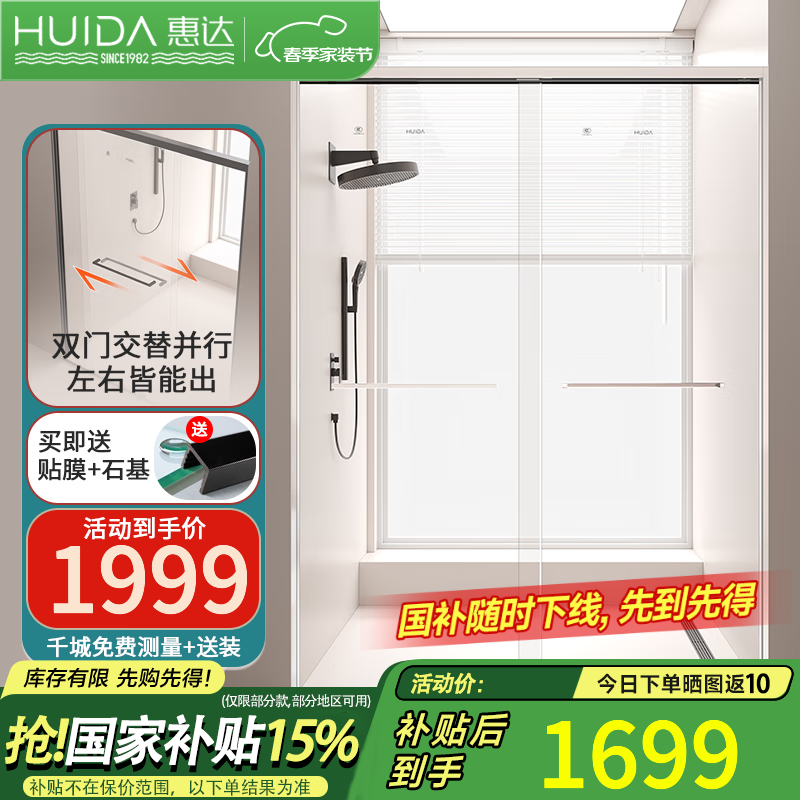 惠达(HUIDA)一字型双活动淋浴房推拉双移门玻璃隔断定制浴屏干湿分离淋浴房 双移门【1.1-1.19】雪山银