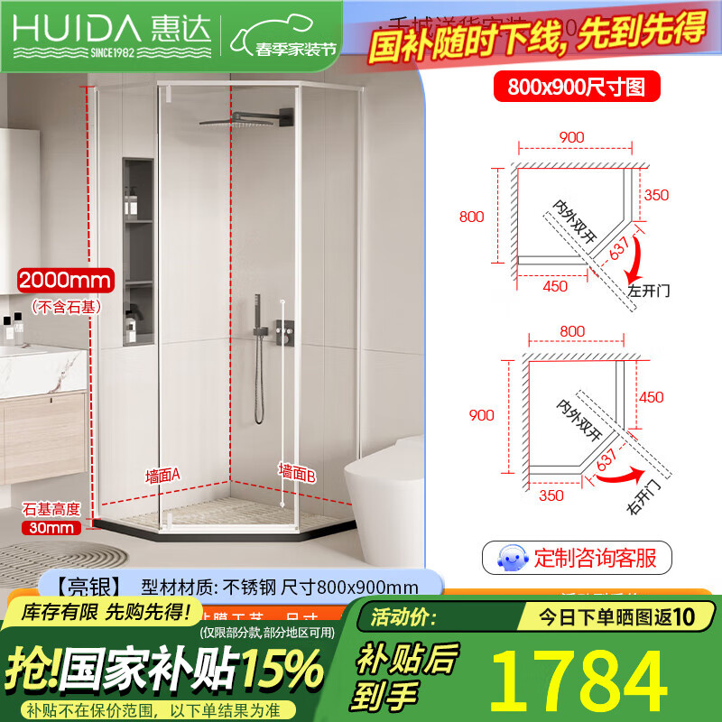 惠达淋浴房玻璃隔断钻石型移门推拉门干湿分离极窄卫生间浴室浴屏浴房 亮银 900*900**2000mm