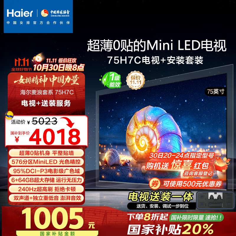 海尔(Haier) 【麦浪套系】电视75英寸0贴AIMiniLED包安装版【固定挂架送装一体】576分区背光国家补贴1级75H7C