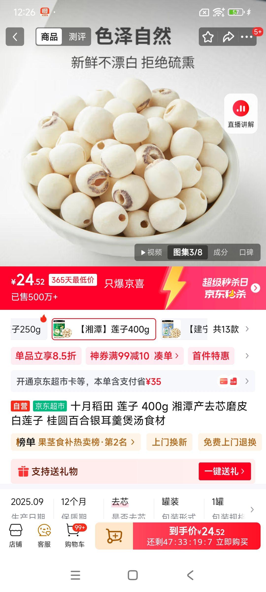 plus会员:十月稻田 莲子 400g 湘潭产去芯磨皮白莲子 桂圆百合银耳羹煲汤食材