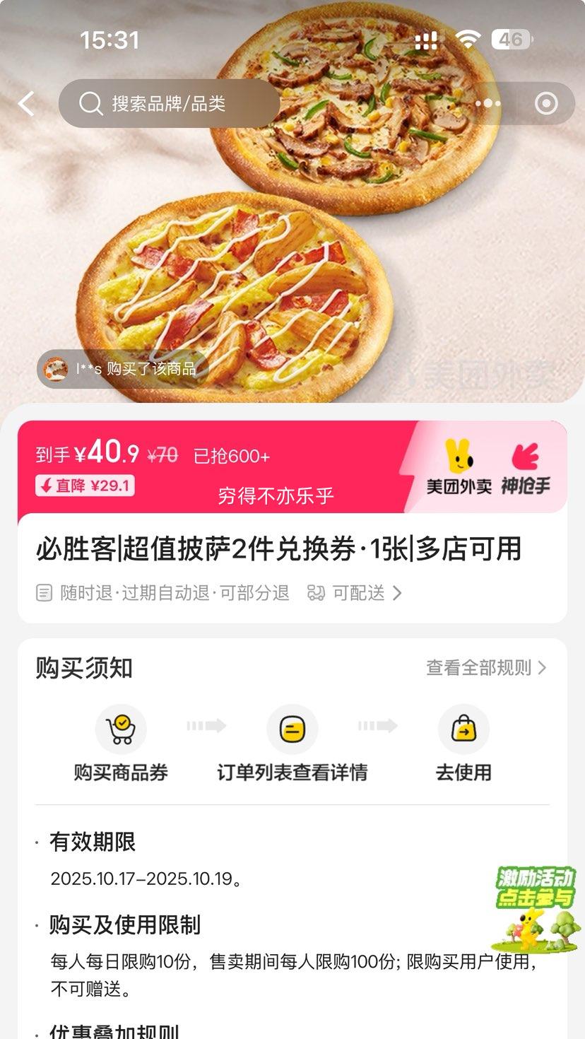 ??【外卖】必胜客|超值披萨2件兑换券·1张|多店可用 ??门市价70元现价仅需46元 ??多店可用
