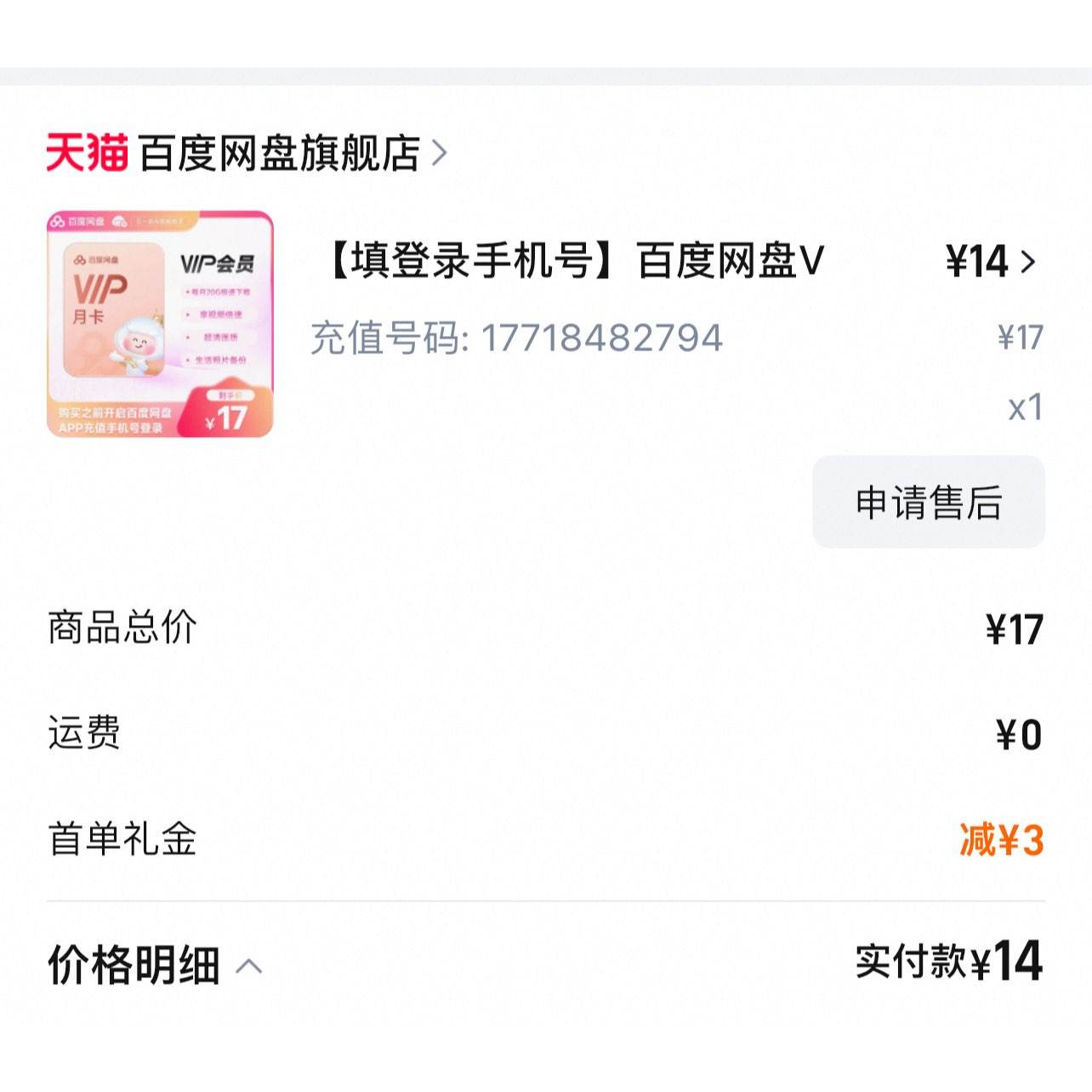 【填登录手机号】百度网盘VIP会员1个月 百度云盘月卡 自动充值