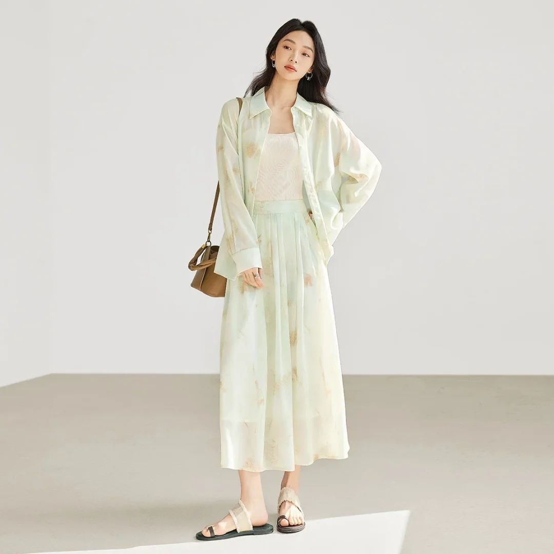 超V:对白 春秋装轻薄晕染印花长袖衬衫中长半裙两件套女式通勤套装