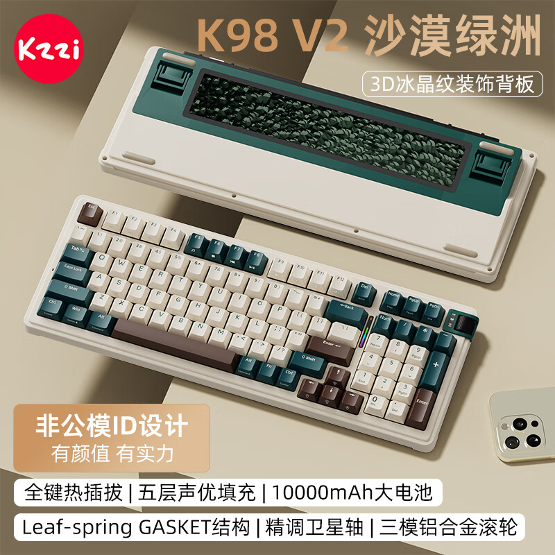 珂芝(KZZI)K98Pro无线机械键盘蓝牙有线三模游戏电竞办公键盘98键gasket客制化RGB热插拔胶坨坨麻将音 K98 V2沙漠绿洲-蓝莓静音轴-10000mAh 98键