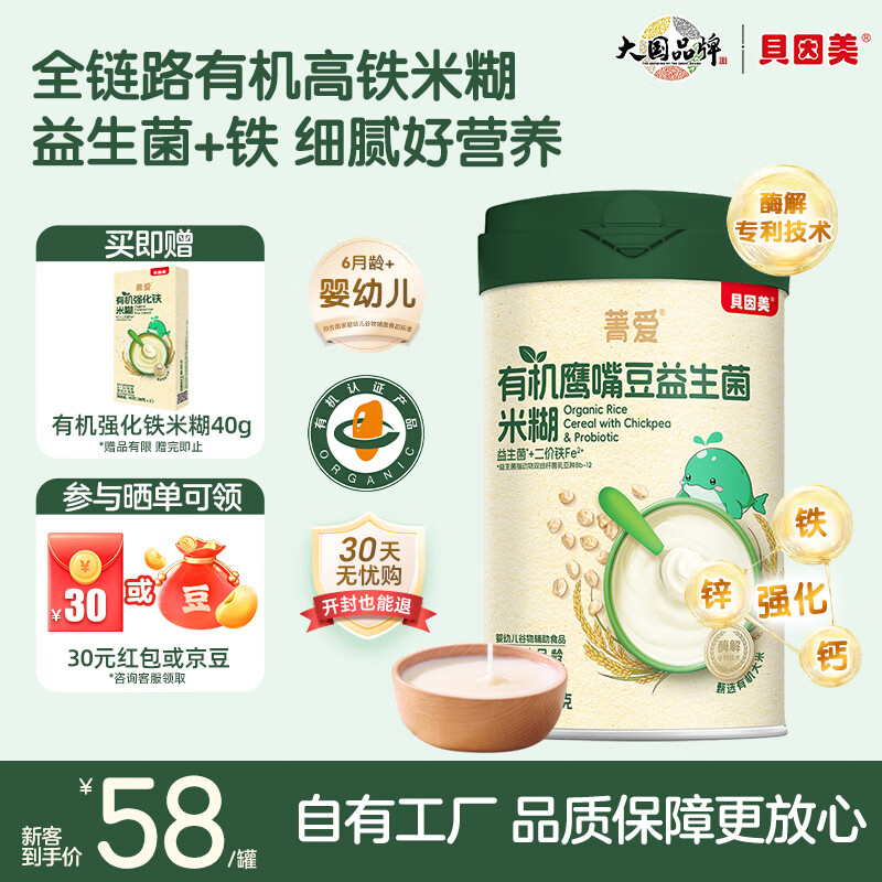 贝因美菁爱有机婴幼儿高铁米粉宝宝辅食钙铁锌营养米糊益生菌7月+ 218g