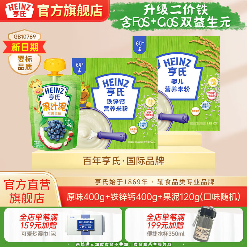 亨氏(Heinz)【2盒装】高铁双绿宝宝米粉益生元婴儿辅食钙铁锌米糊6个月以上吃 原味400g+铁锌钙400g+果泥120g