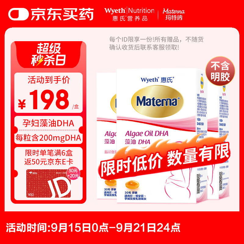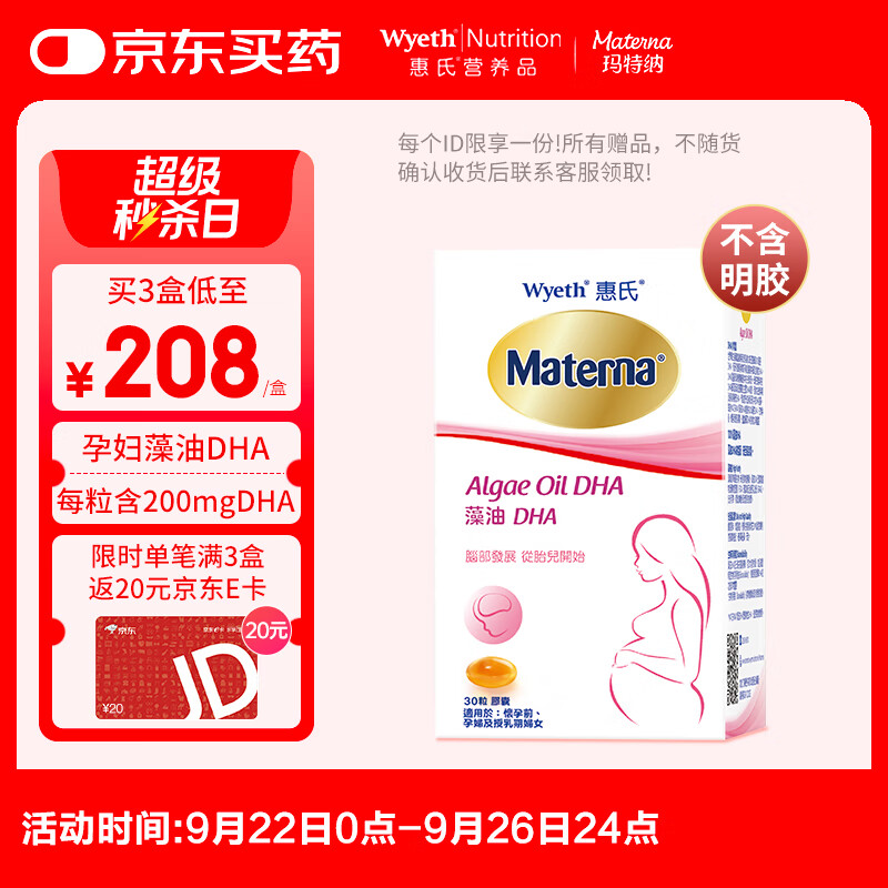 惠氏(Wyeth)dha孕妇胶囊孕早中晚期成人海藻油dha备孕哺乳期孕期营养 30粒/盒