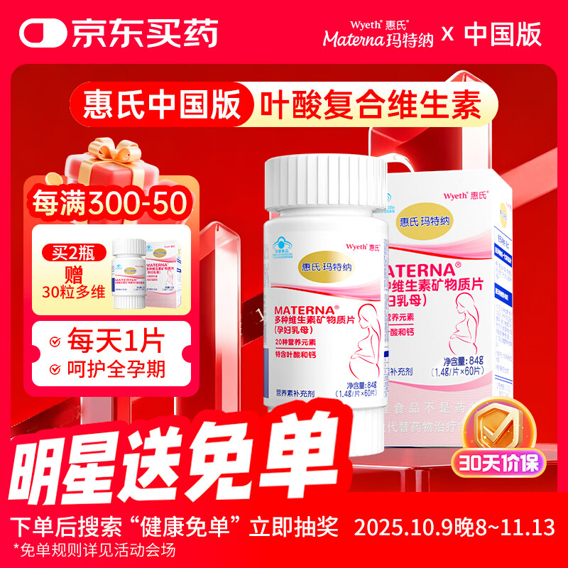 玛特纳(MATERNA)中国版惠氏孕妇复合维生素备孕叶酸片钙铁锌硒多维片孕期营养品 孕妇维生素60片/瓶(60天量)