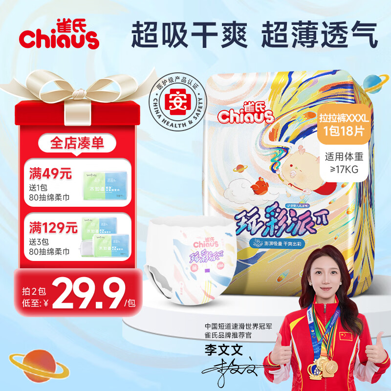 雀氏玩彩派纸尿裤尿不湿新生儿尿裤柔薄透气吸量大超薄干爽【新升级】 拉拉裤-3XL码-18片