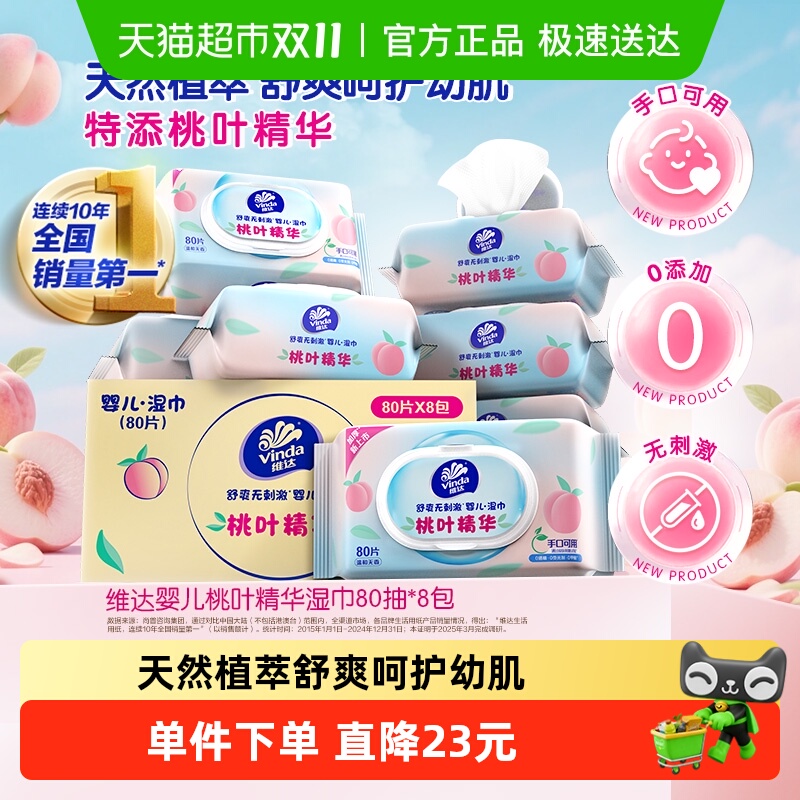 【下拉享优惠】维达桃叶精华婴儿湿巾80片8包舒缓纯水加厚箱装