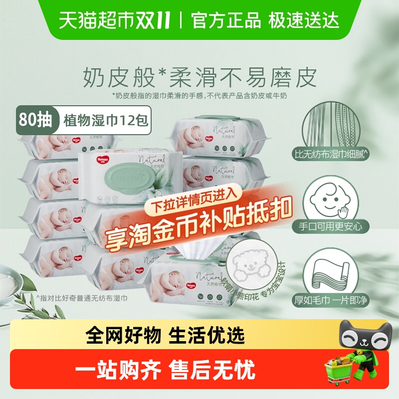 好奇小森林奶皮湿巾80抽12包箱装加厚11%婴儿宝宝手口屁可用