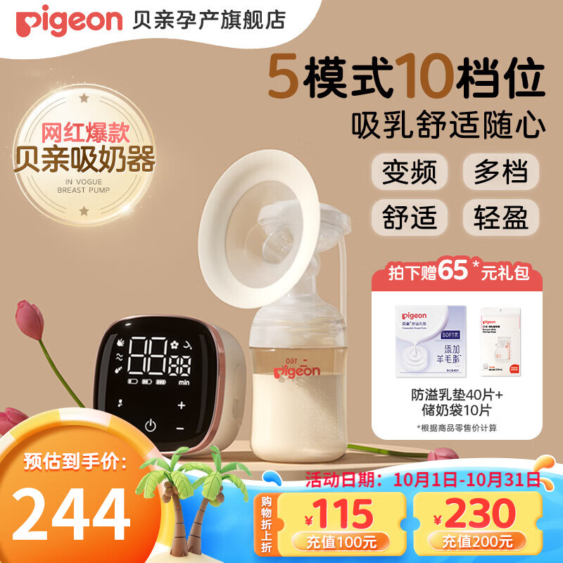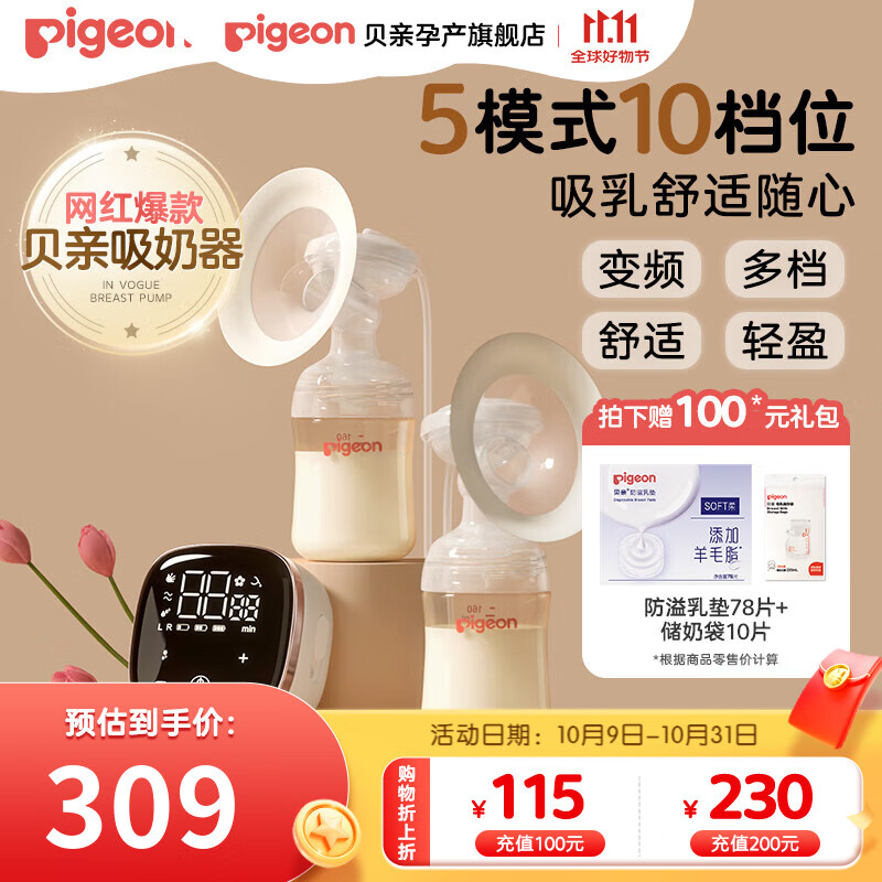 Pigeon贝亲双边电动吸奶器全自动挤奶器可充电锂电池静音微震按摩