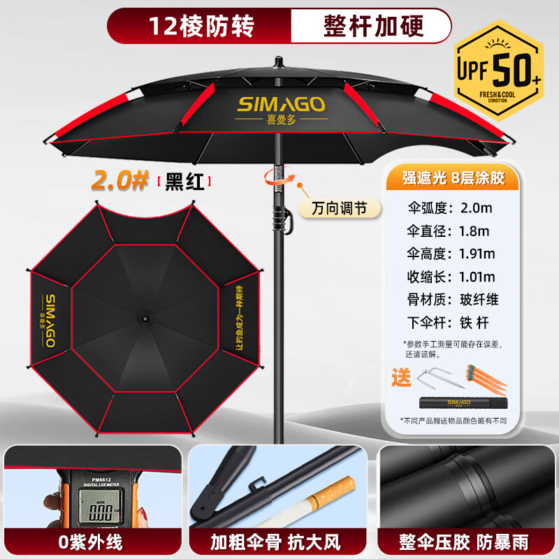 百亿补贴:SIMAGO喜曼多钓鱼伞万向大钓伞防风防暴雨伞钓鱼渔具加厚防晒户外遮阳伞 2米 双层加厚加硬防暴晒UPF50+